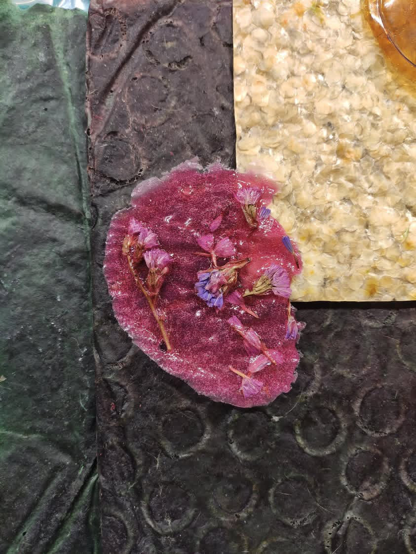 During an experiment involving petals, flowers, and plant matter in bioplastics and textile dyeing, one unassuming sample - after returning to the lab and being placed near a window - started to sprout. A sneaky seed had made its way into the mix and, nourished by the experimental substrate, decided to grow.